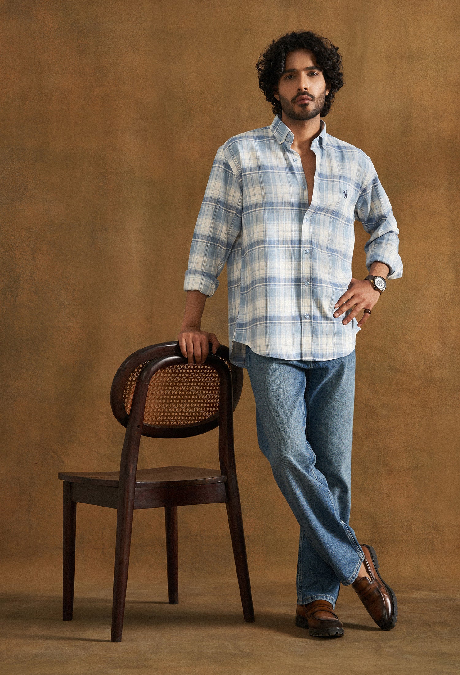 The Zen Blue Shirt, made from 100% cotton, features a blue and white check. It has subtle matte finish buttons, and contrast logo embroidery on the chest. While checks remain timeless, this one is especially so owing to the brilliant herringbone weave.